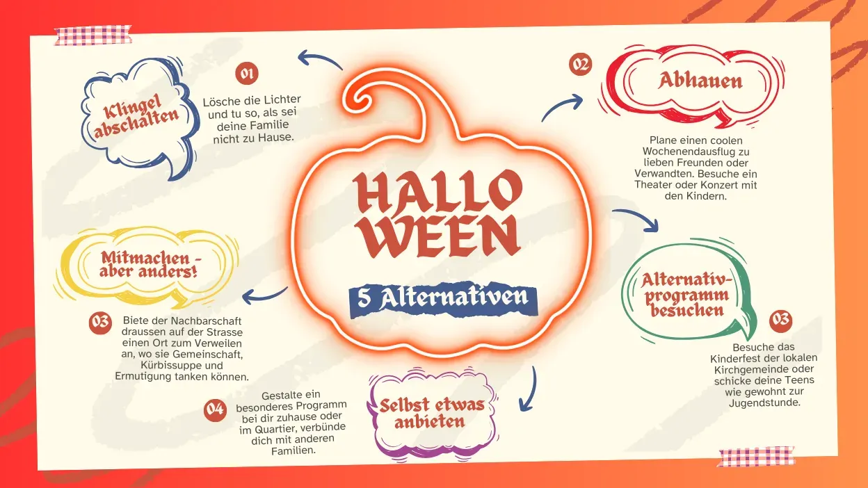 Es gibt grundsätzlich vier Möglichkeiten, Halloween als Familie zu begehen, wenn man kein Fan von Geistern, Vampiren oder Hexengestalten ist. (1) Die Klingel abschalten, (2) einen Wochenend-Ausflug machen, (3) ein Alternativfest der lokalen Kirche besuchen, (4) ein eigenes Programm initiieren. Und letztes Jahr entdeckte ich noch eine fünfte Alternative, welche ich am Schluss vorstellen werde.