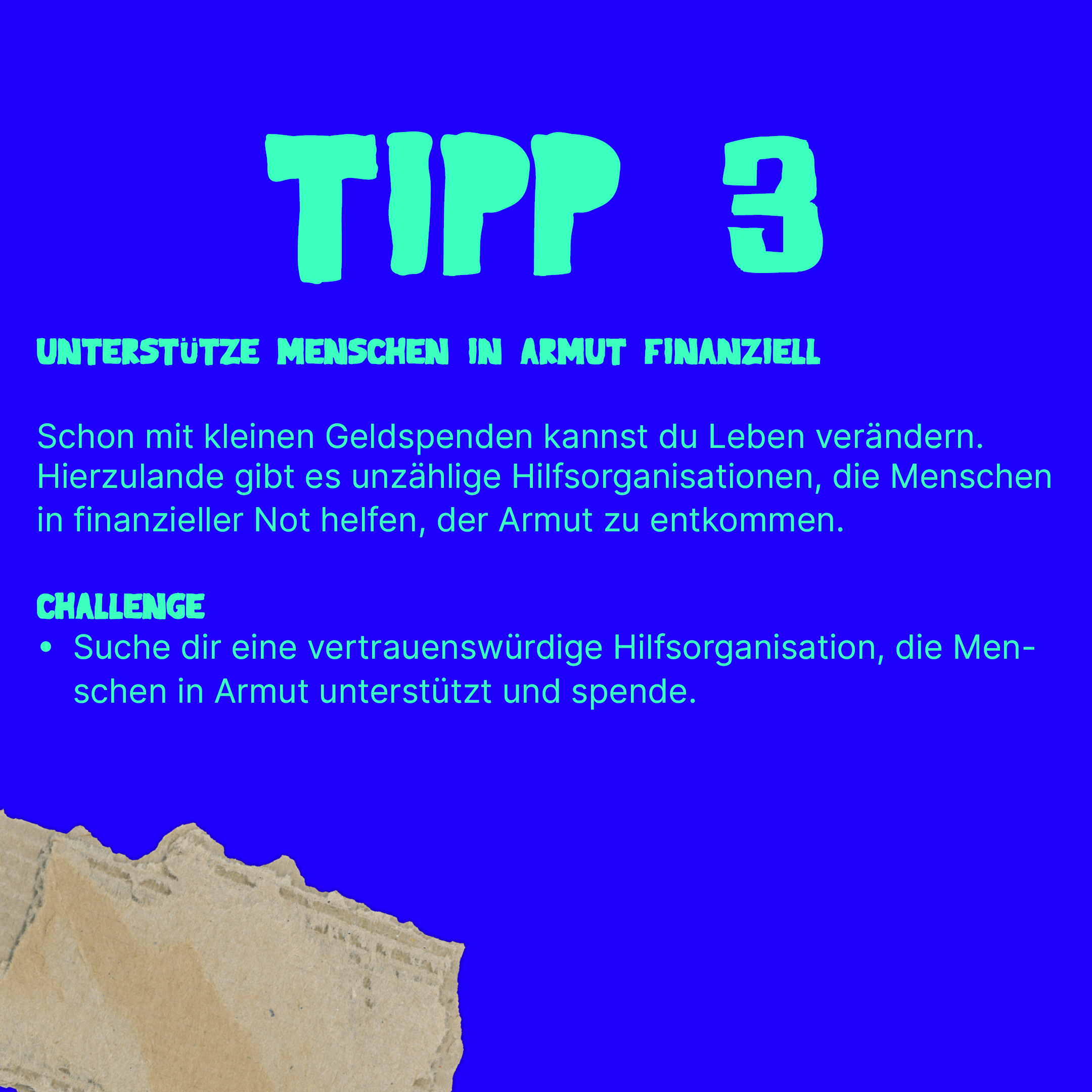 Hier kommt ein »No Brainer« (zu deutsch: klare Sache): Eine direkte Möglichkeit, Menschen in Armut zu helfen, ist die finanzielle Unterstützung. Dies kann durch Spenden an gemeinnützige Organisationen oder persönliche Kontakte in Not geschehen. Jeder Beitrag, egal wie klein, kann einen großen Unterschied im Leben einer Person machen. Fehlt das eigene Geld, kann man einen Kuchenverkauf, einen Sponsoringlauf oder ein Benefizkonzert organisieren.