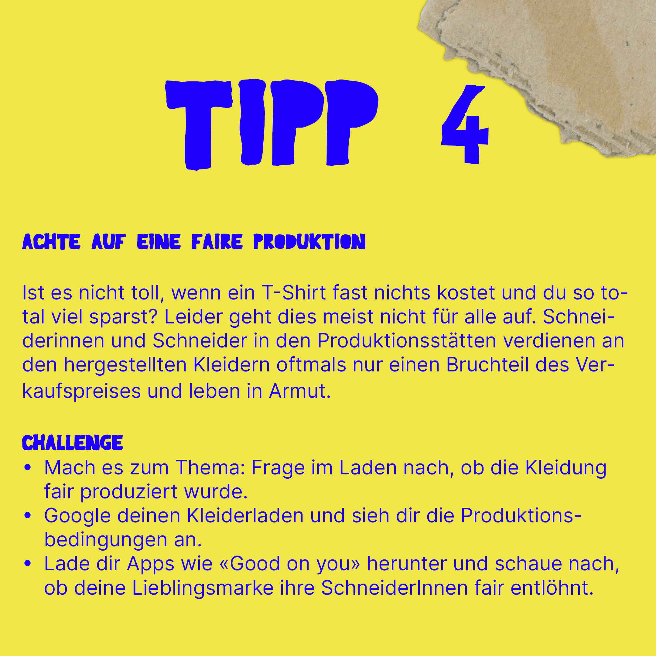 Indem wir auf faire Produktionsbedingungen achten, können wir sicherstellen, dass Arbeiterinnen und Arbeiter ein gerechtes Einkommen für ihre Arbeit erhalten. Der Kauf von fair gehandelten Produkten fördert nicht nur nachhaltige Praktiken, sondern hilft auch, Armut in den Produktionsländern zu bekämpfen. Um herauszufinden, ob ein Produkt fair produziert wurde, helfen Apps wie »Good on You«, das Nachfragen im Laden oder eine kurze Google-Recherche. Wer fair produziert, weist dies meist auch sehr prominent aus.