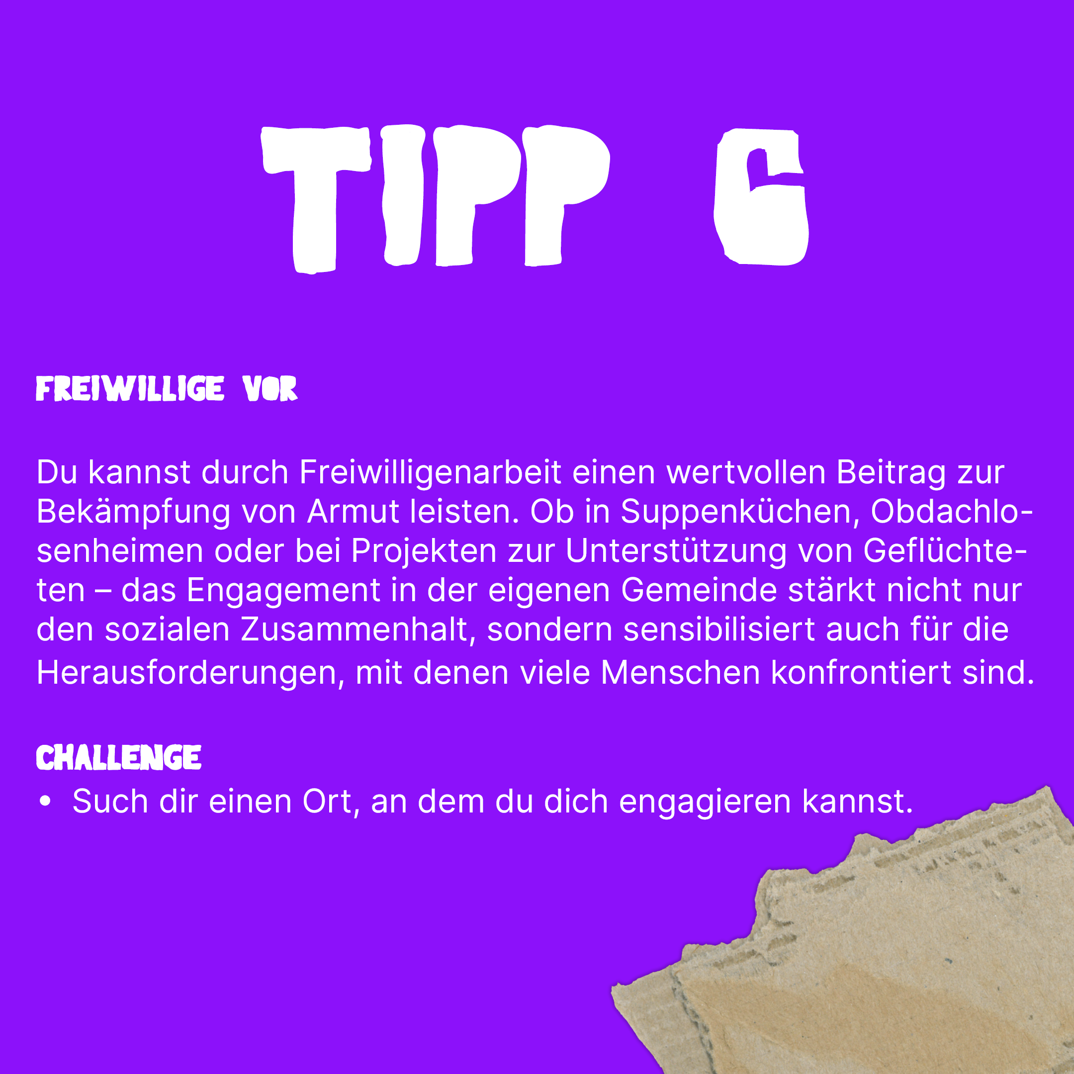 Du kannst durch Freiwilligenarbeit einen wertvollen Beitrag zur Bekämpfung von Armut leisten. Ob in Suppenküchen, Obdachlosenheimen oder bei Projekten zur Unterstützung von Geflüchteten – das Engagement in der eigenen Gemeinde stärkt nicht nur den sozialen Zusammenhalt, sondern sensibilisiert auch für die Herausforderungen, mit denen viele Menschen konfrontiert sind. Solche Erfahrungen fördern Empathie und Verständnis und können junge Menschen dazu inspirieren, aktiv für Veränderung einzutreten.