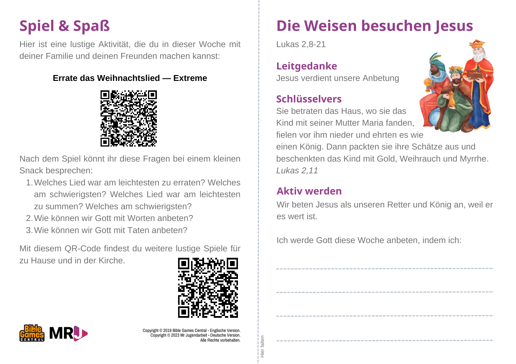 Schreibt auf die erste Seite des Mitnahmezettels unter den Abschnitt »Aktiv werden«, wie ihr Jesus diese Woche anbeten wollt.