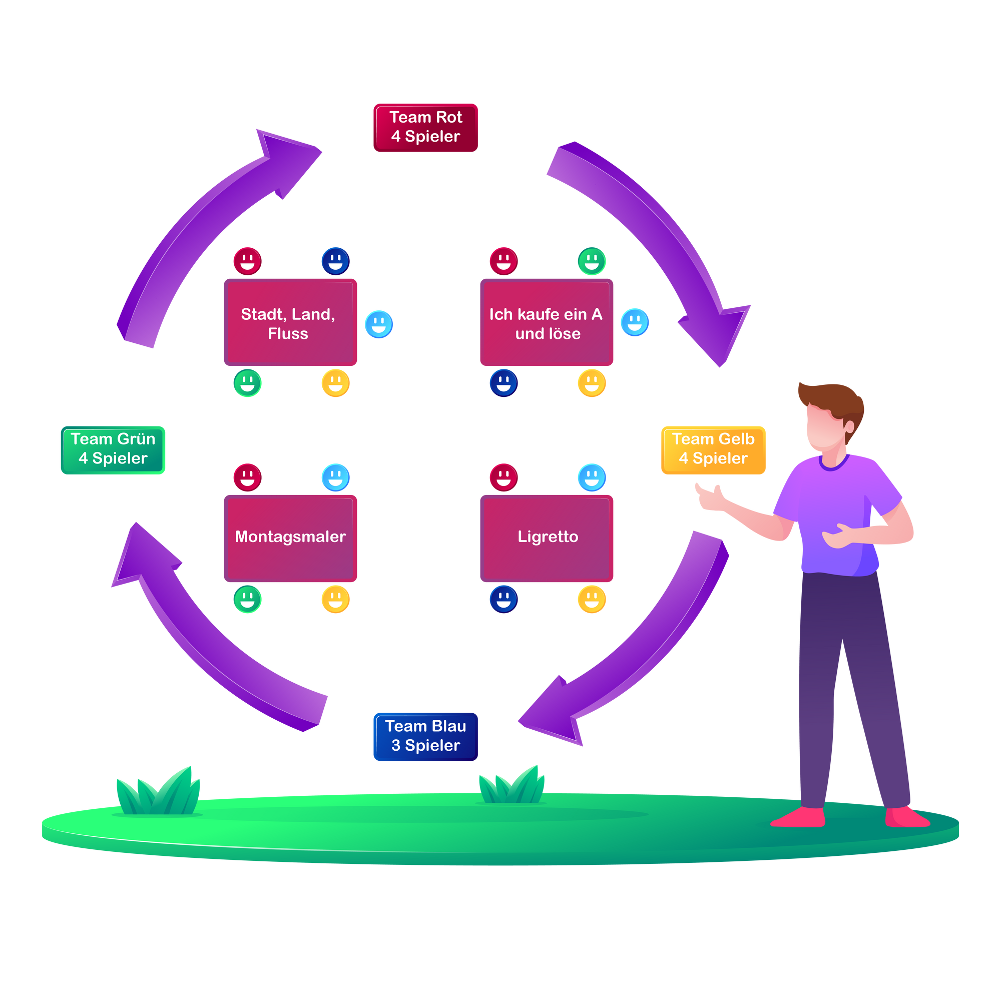 Jedes Team entsendet ein Teammitglied an jeden Spieltisch, das versucht, Punkte für das eigene Team zu gewinnen. Gewonnen hat das Team mit der höchsten Punktzahl, am Ende des »Brettspiel-Roulettes«.