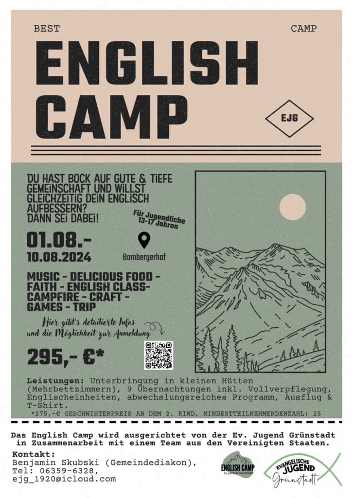 Du hast Bock auf gute & tiefe Gemeinschaft und willst gleichzeitig dein Englisch aufbessern? Dann sei bei unserem English Camp mit dabei. Ein super motiviertes Team aus den Vereinigten Staaten freut sich in dir auf entspannte Art & Weise Freude an der amerikanischen Kultur und Sprache zu wecken. Also auch für jeden, der mit Englisch momentan noch nicht so viel anzufangen weiß. Die Woche ist vollgepackt mit English Sessions, Musik, Tiefgang (Chapel), leckerem Essen, guten Spielen, Kreativaktionen, Lagerfeuer und einem Ausflug. Außerdem haben wir noch eine Überraschungsaktion für den einen Abend geplant.