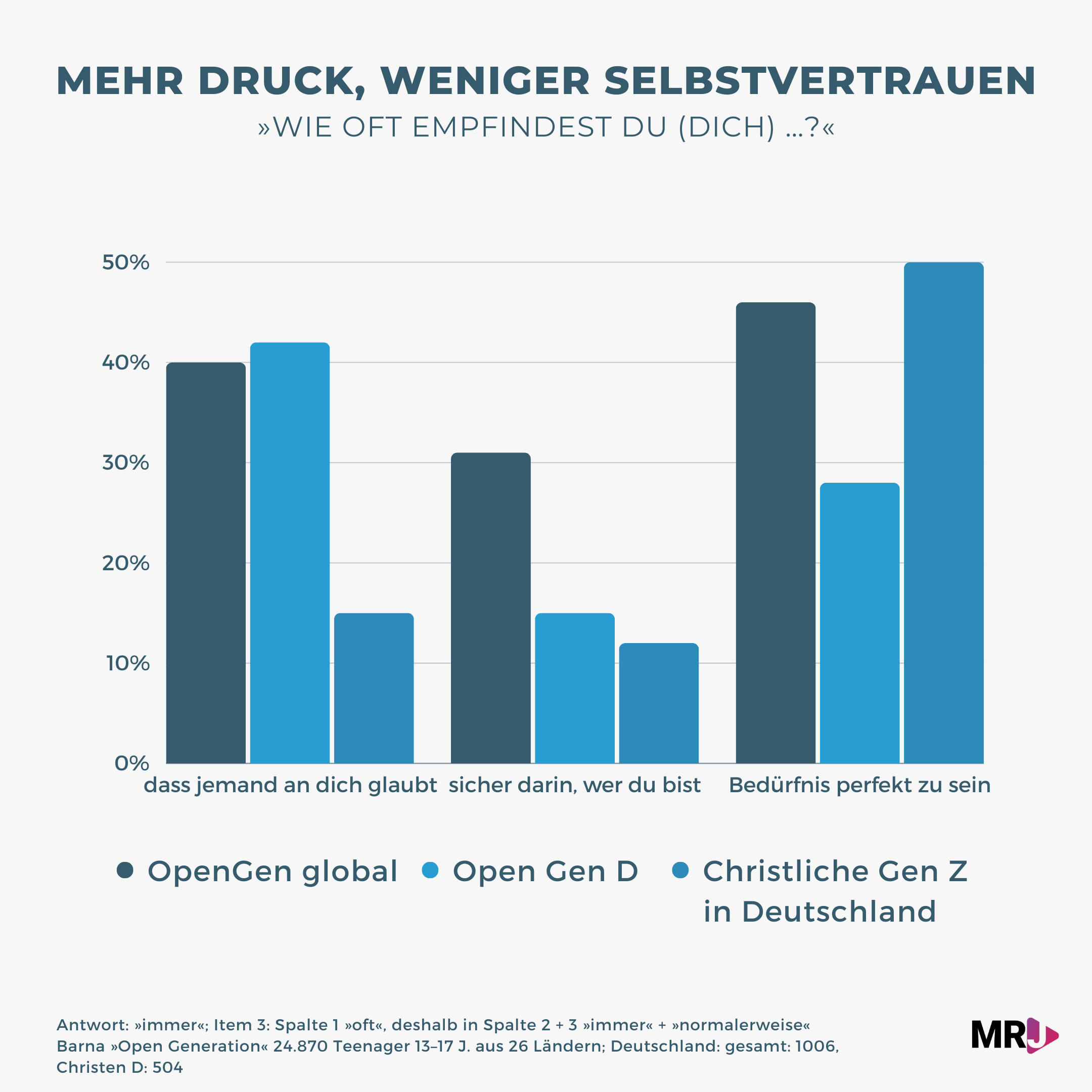 - Nur 15% haben »immer« (42% »normalerweise«) das Gefühl, dass jemand an sie glaubt; dies ist ein sehr niedriger Wert, denn bei der deutschen Gen Z aus der Open Generation-Umfrage sind es 42%/38%, bei der globalen Gen Z 40%/37%.