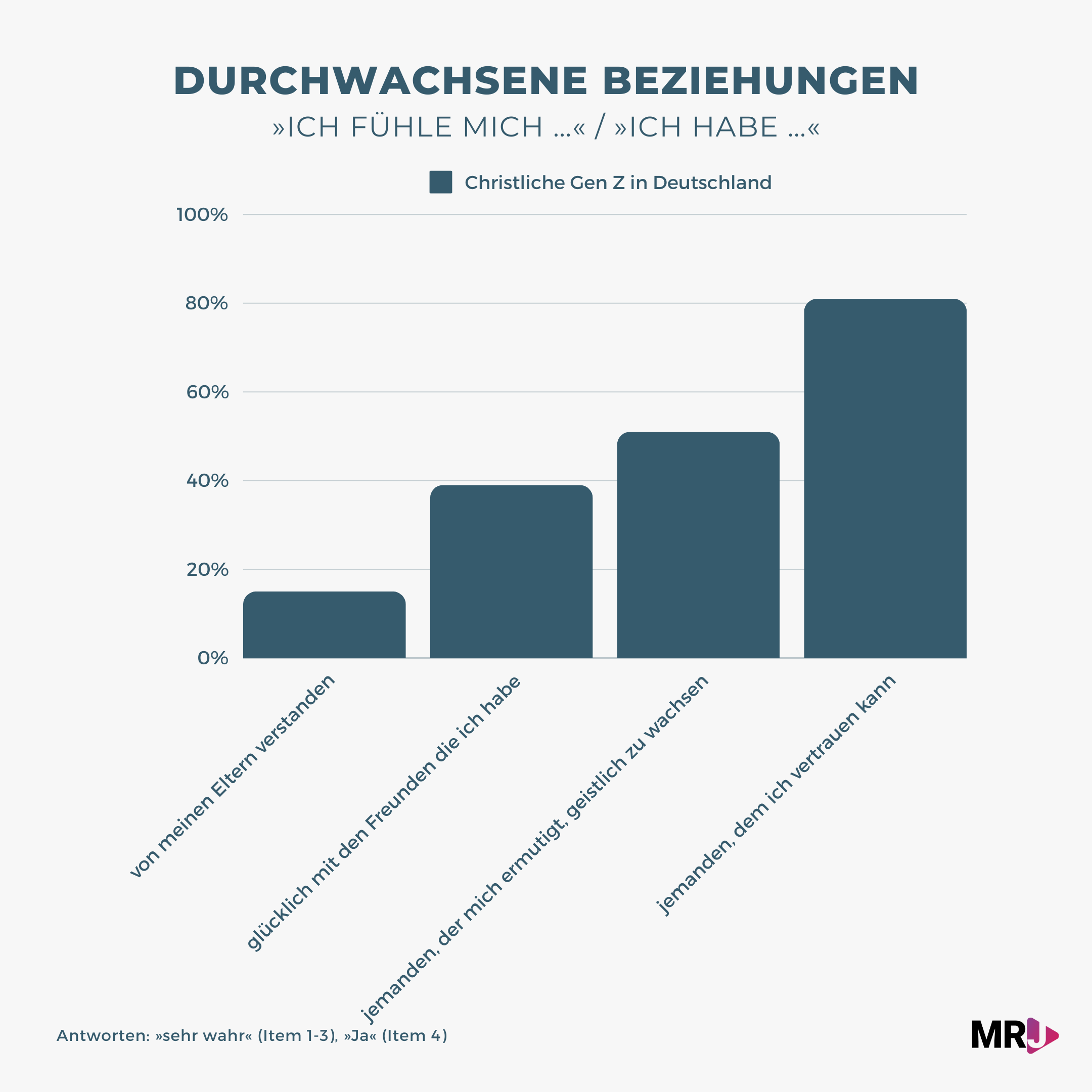 • Sie weist jeweils über 50% (gegenüber 12-15% bei der christlichen Gen Z in Deutschland) stark positive Antworten auf bei »jemand glaubt an mich«, »ich fühle mich von meinen Eltern verstanden« sowie bei der Selbstsicherheit.