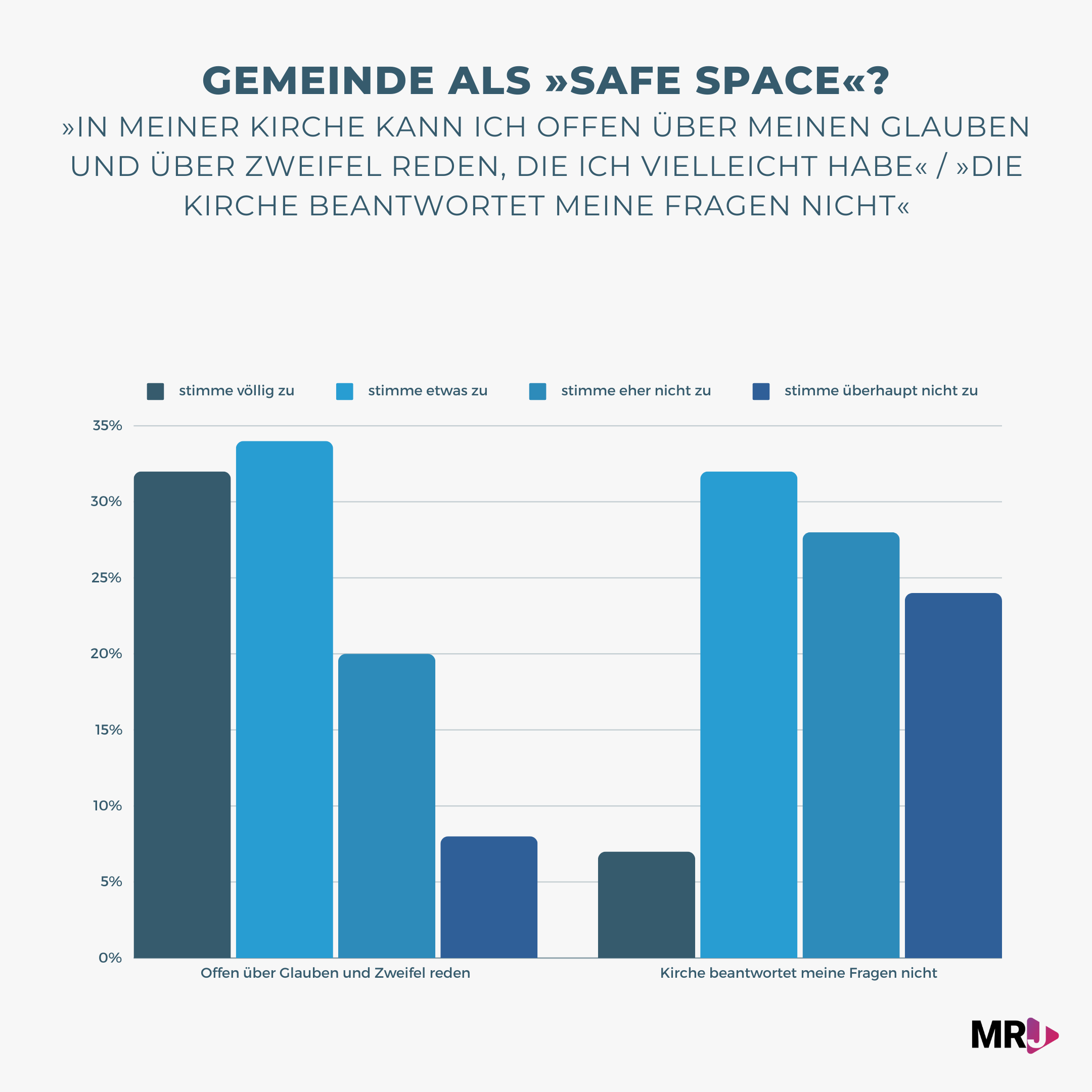 - Rd. 25-35% der Teilnehmenden bejahen deutlich, dass sie in der Gemeinde Platz für Zweifel finden, ihre Fragen beantwortet bekommen oder für ein treues Leben in einer säkularen Welt ausgerüstet werden.[11] Ähnlich viele verneinen dies jeweils.