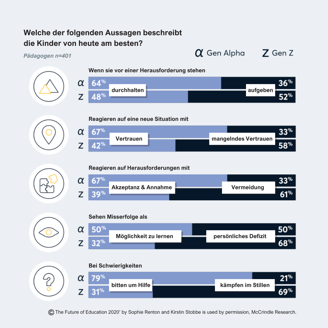 Die Alphas sind extrem digital, global, mobil, inklusiv, kooperativ und visuell. Laut Educational Future Report 2020 ist Gen Alpha fokussiert auf persönliches Wachstum und ihre Denkweise unterscheidet sich von Gen Z. Alphas sind eher bereit, durchzuhalten statt aufzugeben. Sie bitten eher um Hilfe, als in der Stille zu kämpfen. Misserfolge werden viel mehr als Möglichkeiten zum Lernen gesehen. Wie sich die Denkweise der Alphas auf die Gestaltung ihres Lebens weiter ausprägt, wird sich noch zeigen.