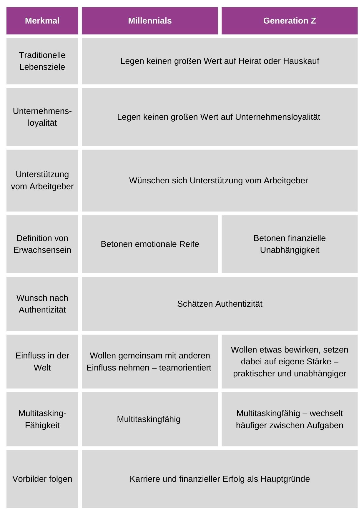 Beide Generationen legen keinen großen Wert auf traditionelle Lebensziele wie Heirat oder Hauskauf. Keine der beiden Generationen legt großen Wert auf Unternehmenstreue, aber beide wollen von ihrem Arbeitgeber unterstützt werden. Während die Millennials emotionale Reife als Zeichen für Erwachsensein sehen, legt die Generation Z mehr Wert auf finanzielle Unabhängigkeit. Beide Generationen schätzen Authentizität und wollen etwas in der Welt bewirken, jedoch ist die Generation Z eher praktisch und unabhängig im Vergleich zu den teamorientierten Millennials. Beide sind multitaskingfähig, jedoch wechselt die Generation Z häufiger von einer Aufgabe zur nächsten. Laut Barna beziehen sich 6 der 10 Hauptgründe, warum Jugendliche zu ihren Vorbildern aufsehen, auf Karriere oder finanziellen Erfolg.