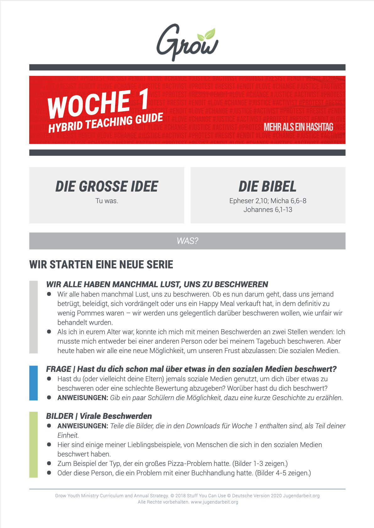 Fragen, Bilder, Social Media Grafiken, Aktivitäten, komplett ausgearbeiteter Jugendgottesdienst, Musik und Diskussionsleitfäden. Lade jetzt alle Tools, Spiele, Andachten und Worksheets für vier Wochen GROW: Mehr als ein Hashtag herunter.