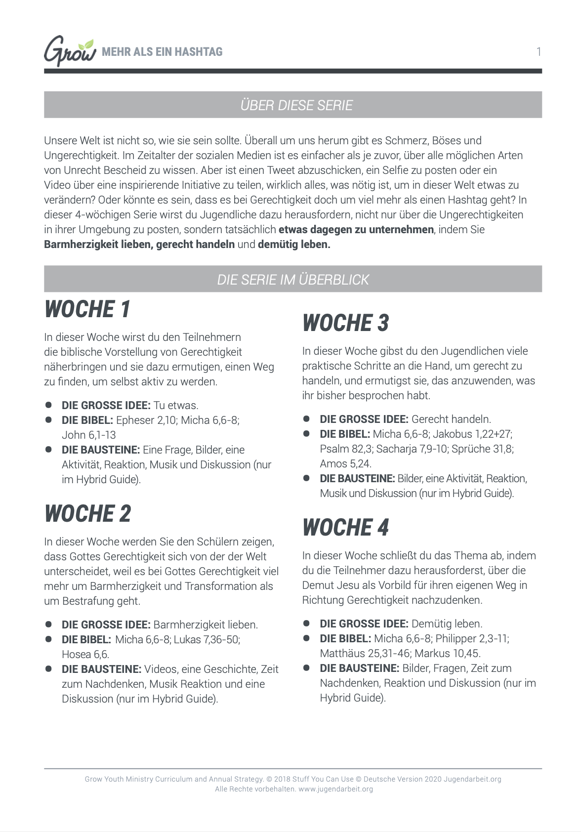 In dieser 4-wöchigen Serie wirst du Jugendliche dazu herausfordern, nicht nur über die Ungerechtigkeiten in ihrer Umgebung zu posten, sondern tatsächlich etwas dagegen zu unternehmen, indem sie Barmherzigkeit lieben, gerecht handeln und demütig leben.
