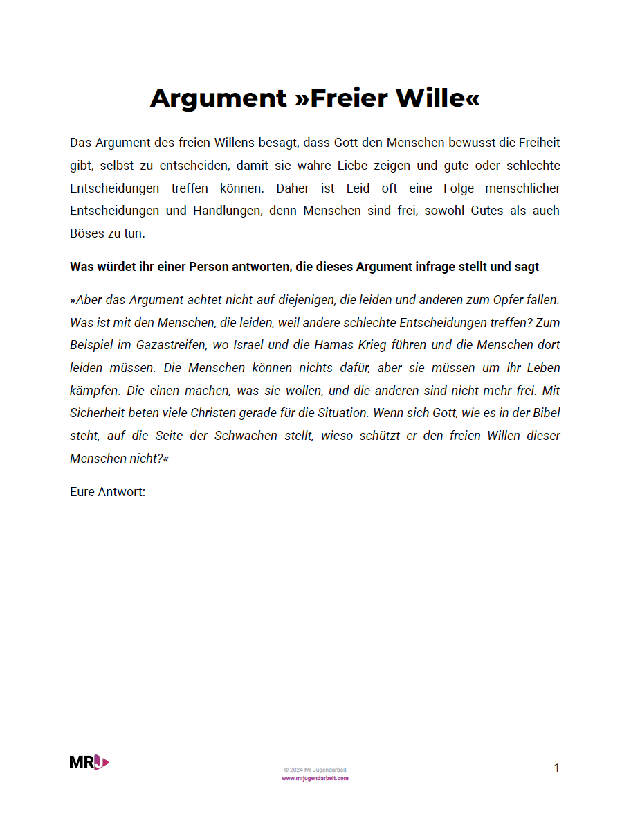 Lade die Arbeitsblätter herunter und drucke die Argumente »Freier Wille« und »Seelenreifung« herunter. Mache ausreichend Kopien für deine Arbeitsgruppen.