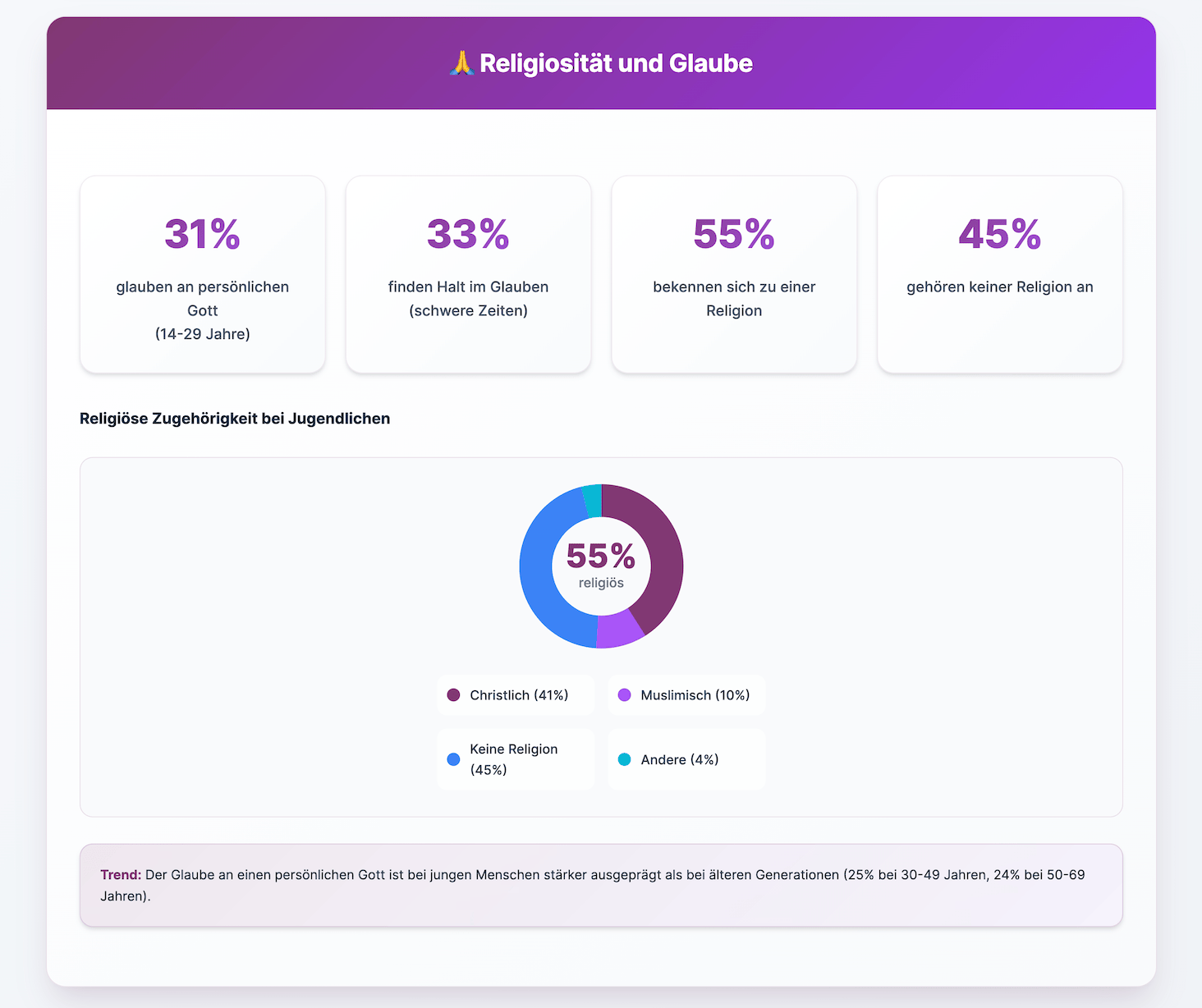 Warum das wichtig ist: Glaube ist da – aber nicht sichtbar. Junge Menschen glauben anders: persönlich, aber selten kirchlich. Gleichzeitig wächst der seelische Druck. Social Media ist Hauptinformationsquelle, doch auch Stressfaktor. WhatsApp, Insta und TikTok prägen die Identität stärker als jede Predigt.