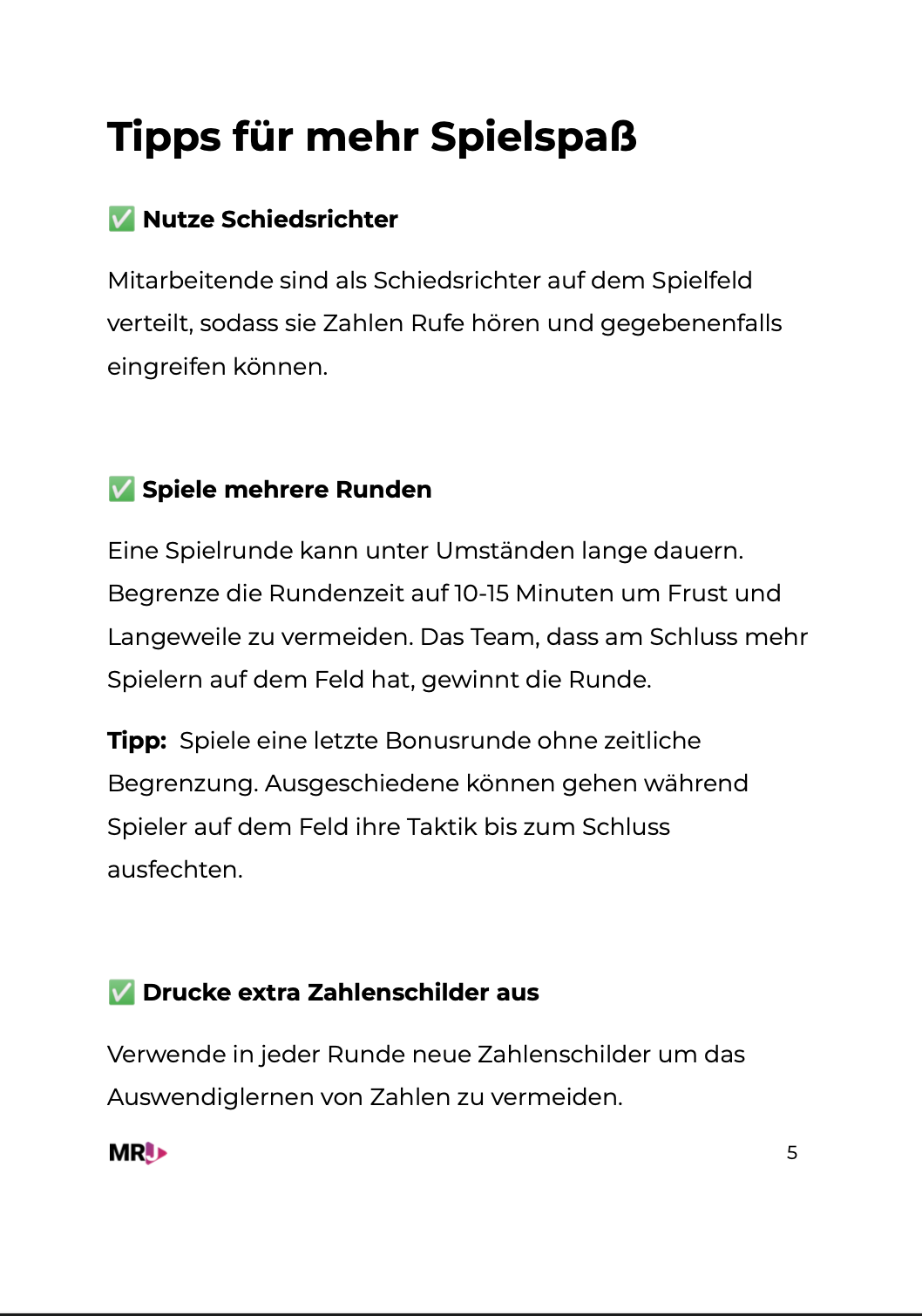 Um wildes Zahlenraten zu unterbinden, empfehlen wir zu jeder Zahl noch ein Merkmal des gegnerischen Spielers zu rufen.