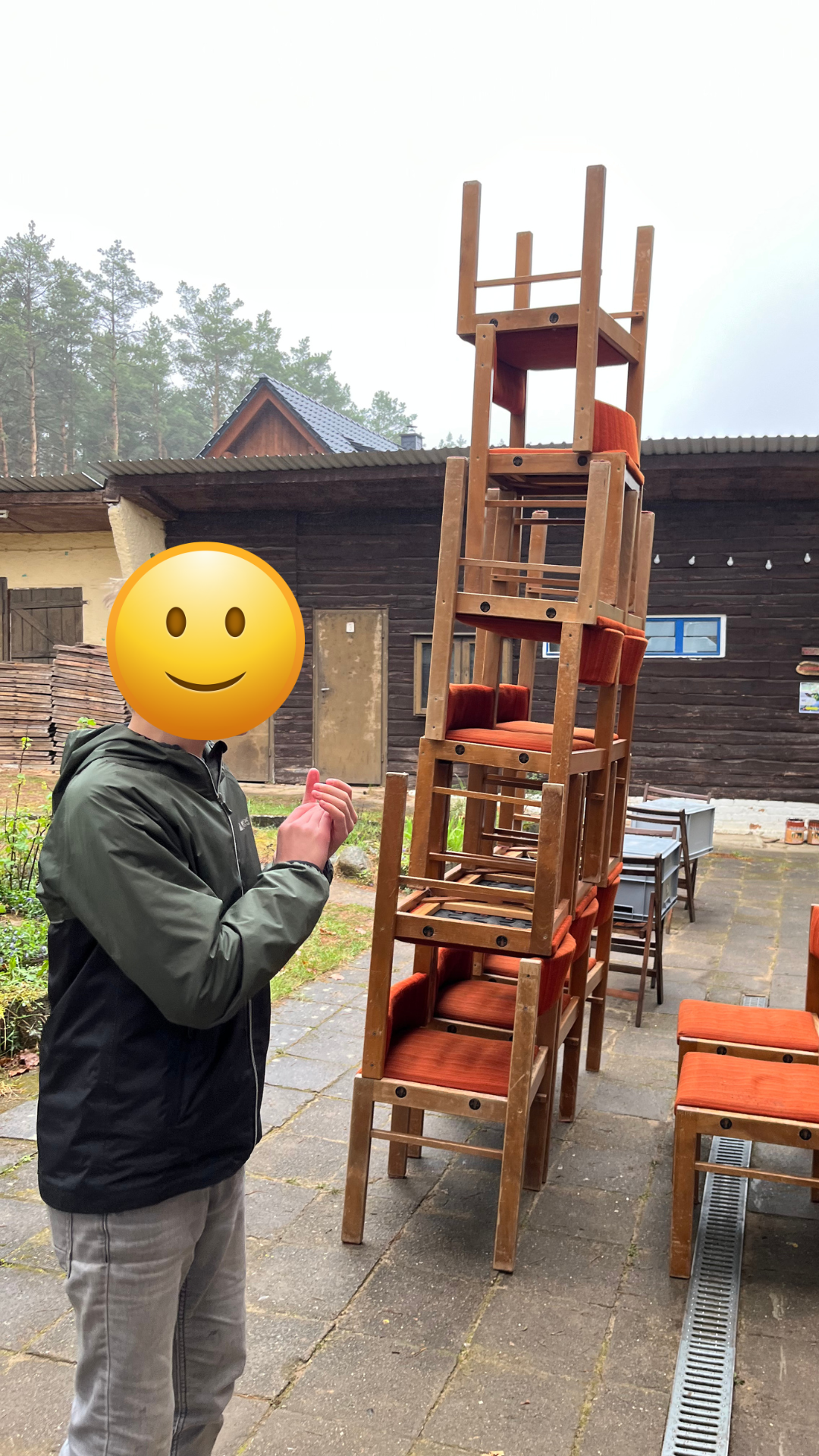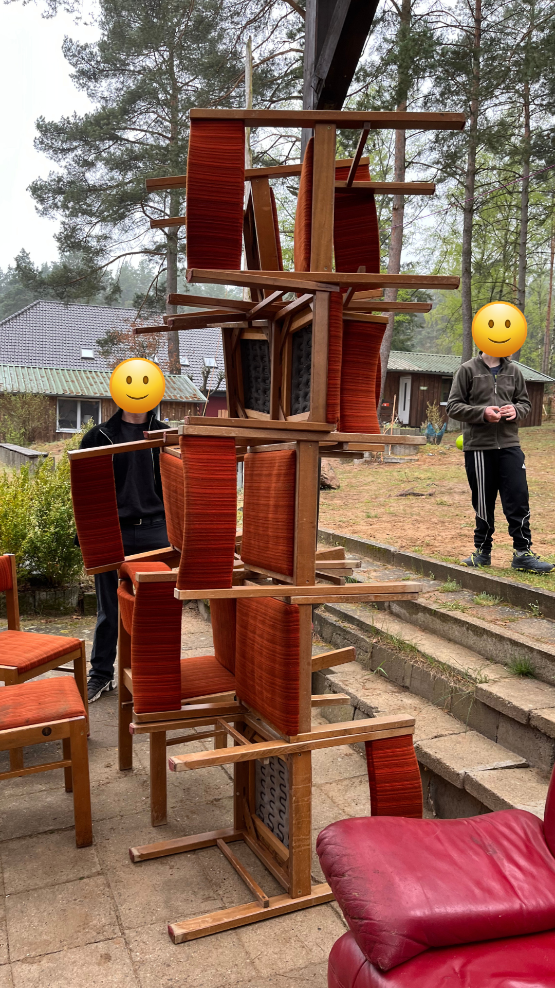 - Ziel ist es, gemeinsam den höchsten, stabilen Turm aus den Stühlen zu bauen. Dieser muss frei und ohne Festhalten oder externe Stütze (z.B. Wand, Mauer) für mind. 10 Sekunden stehen können.