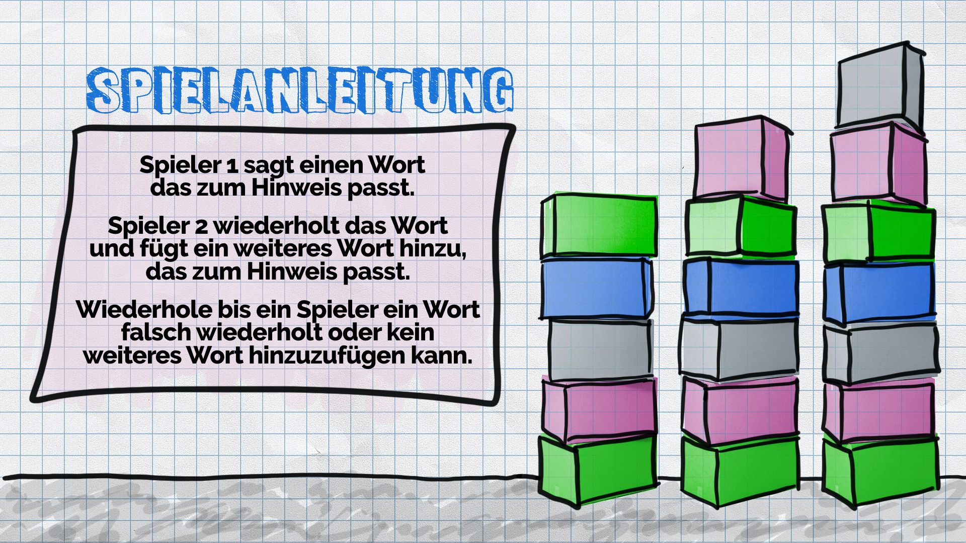 Spieler 1 sagt ein Wort, das zum Hinweis passt. Spieler 2 wiederholt das Wort und fügt ein weiteres hinzu, das ebenfalls zum Hinweis passt.