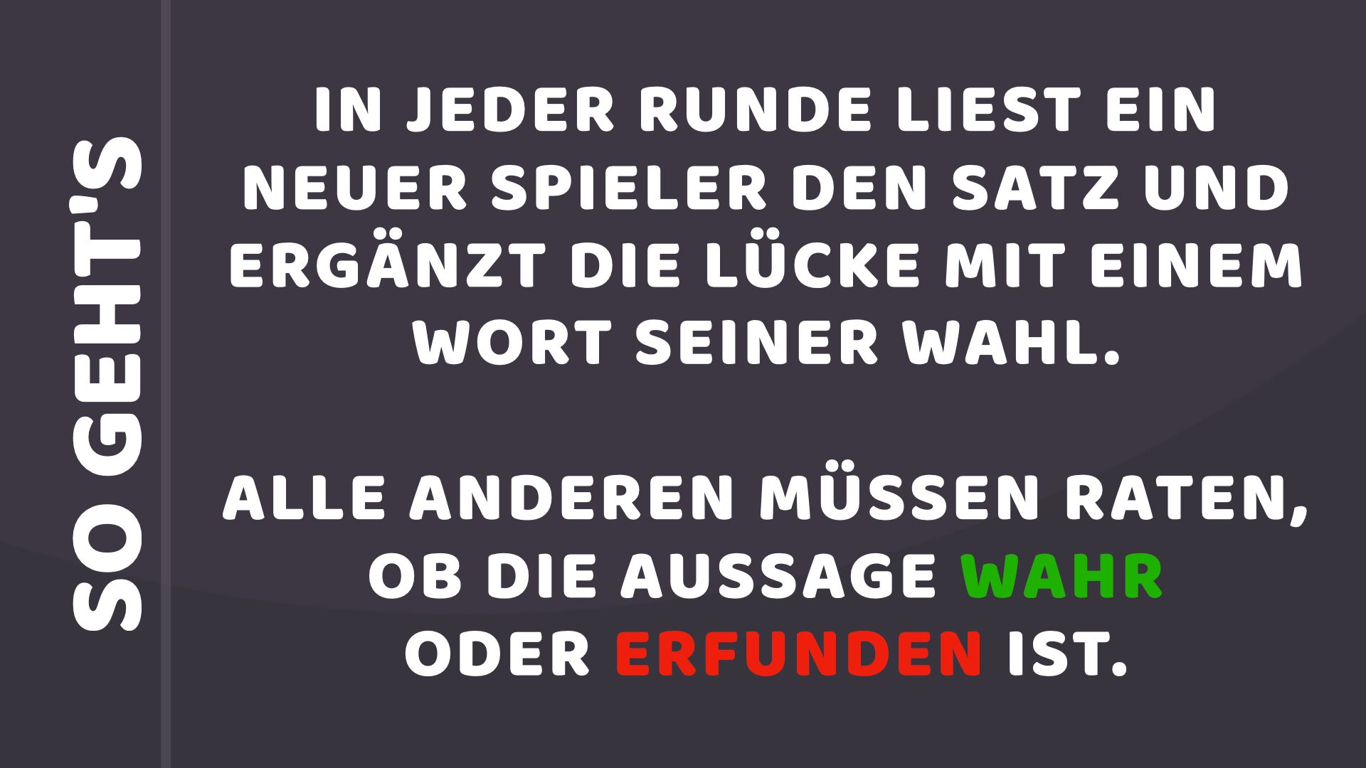 So wird das Gruppenspiel Fact or Cap (Wahr oder erfunden) gespielt: In jeder Runde liest ein neuer Spieler den Satz und ergänzt die Lücke mit einem Wort seiner Wahl. Alle anderen müssen erraten, ob die Aussage wahr oder erfunden ist.