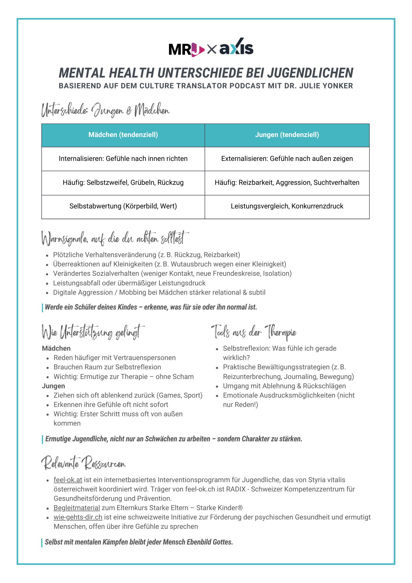 Axis: Wunderschön gesagt. Wenn jetzt jemand tiefer einsteigen will in die Themen, über die wir heute gesprochen haben – oder sich für Ihre Arbeit interessiert – was würden Sie empfehlen? Wo kann man weiterlesen oder Hilfe finden?