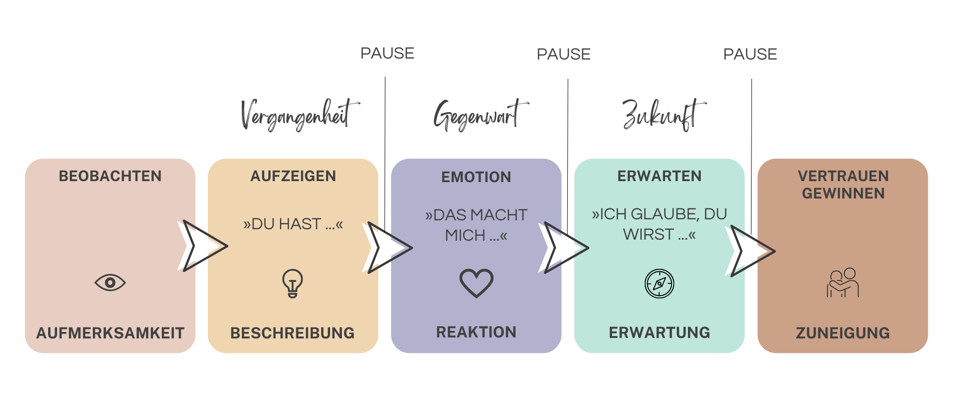 - Im dritten Schritt teilst du mit, was das Verhalten der Person in dir ausgelöst hat – welche Gefühle oder Gedanken sie bei dir hervorgerufen hat. Wieder machst du eine Pause.