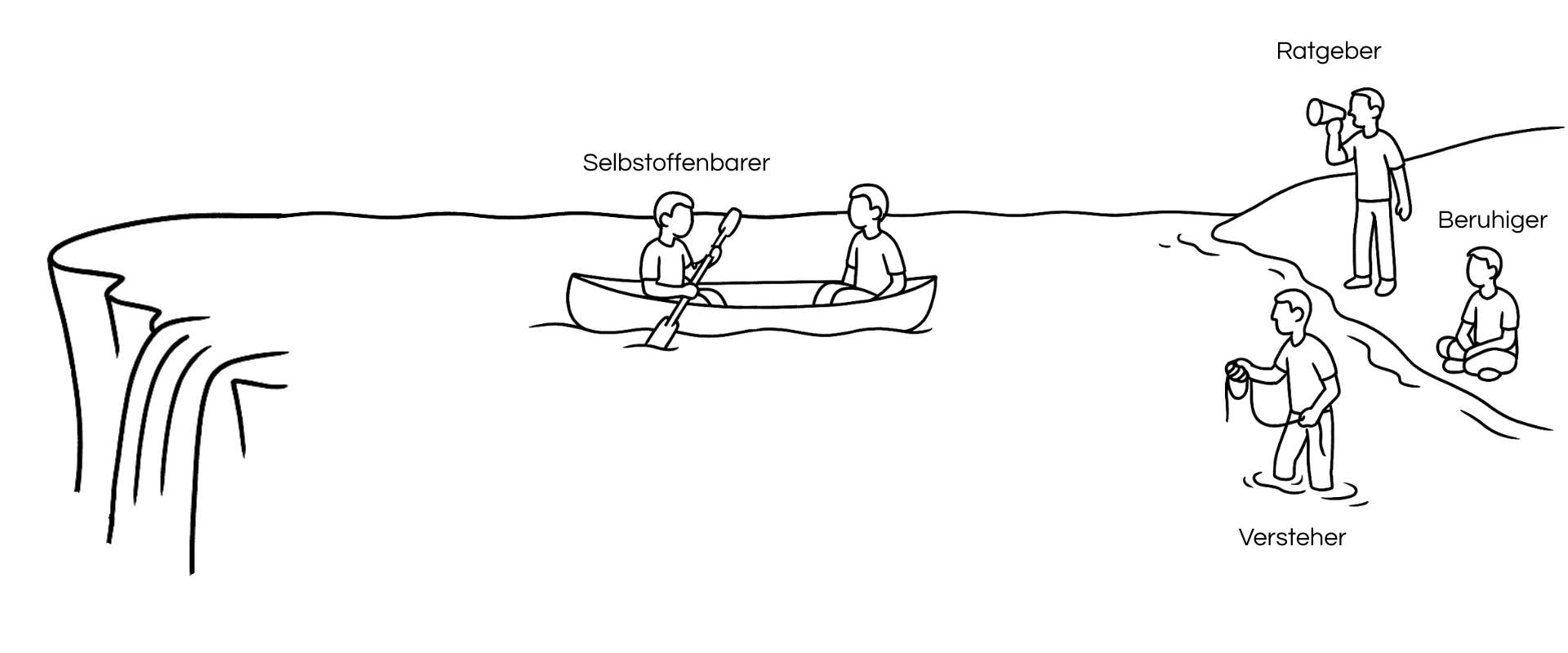 Die vier Reaktionen lassen sich anhand einer einfachen Analogie veranschaulichen: Ein Jugendlicher treibt in einem Kanu auf einen Wasserfall zu – ohne Paddel.