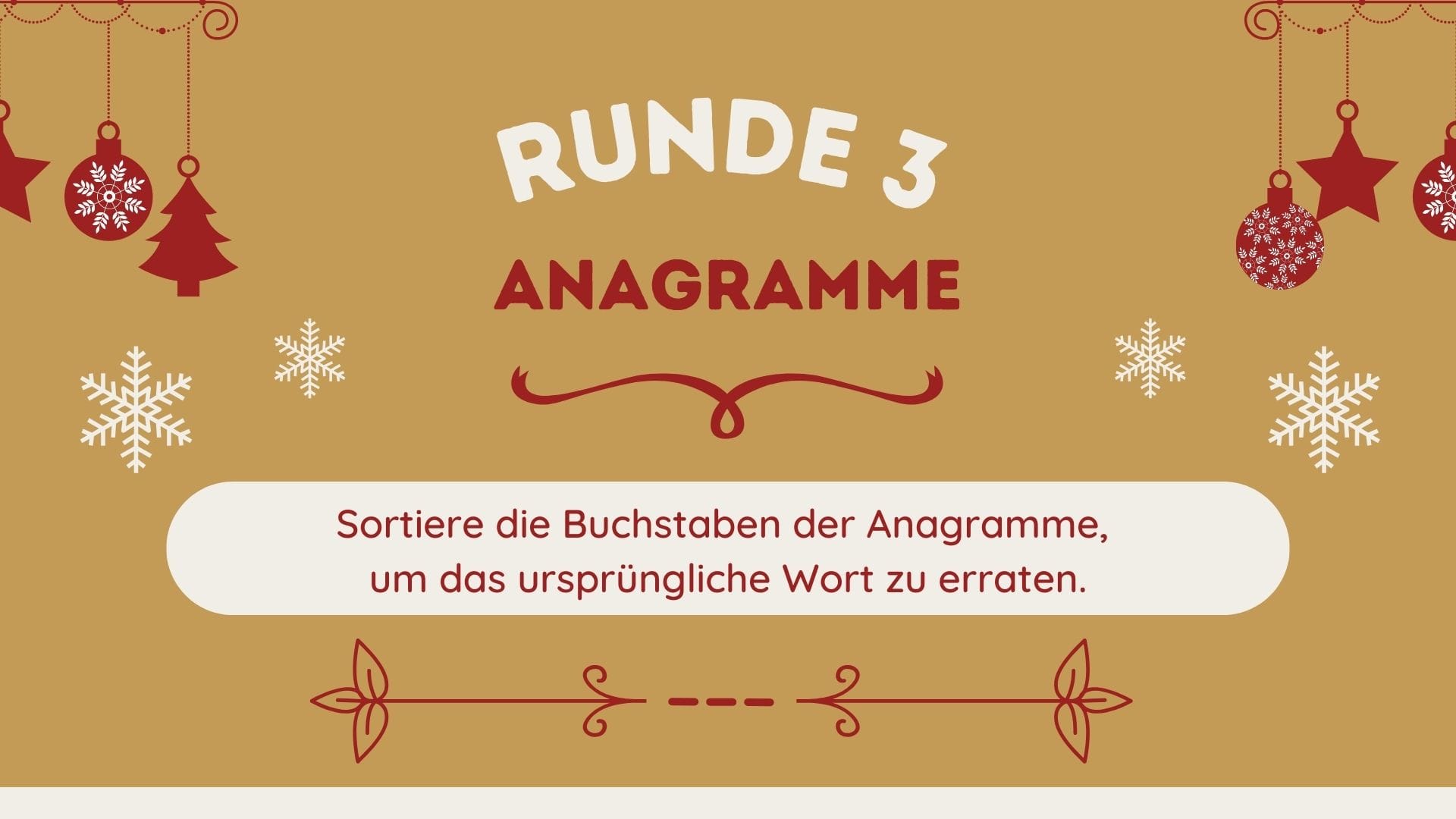 - Runde 3 Anagramme entziffern: Sortiert die Buchstaben der Anagramme, um das ursprüngliche Wort zu erraten.