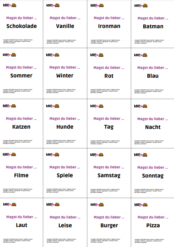 Lade die »Magst du lieber« – Karten herunter, drucke und schneide sie aus. Du brauchst 1 Exemplar pro Spieler.
